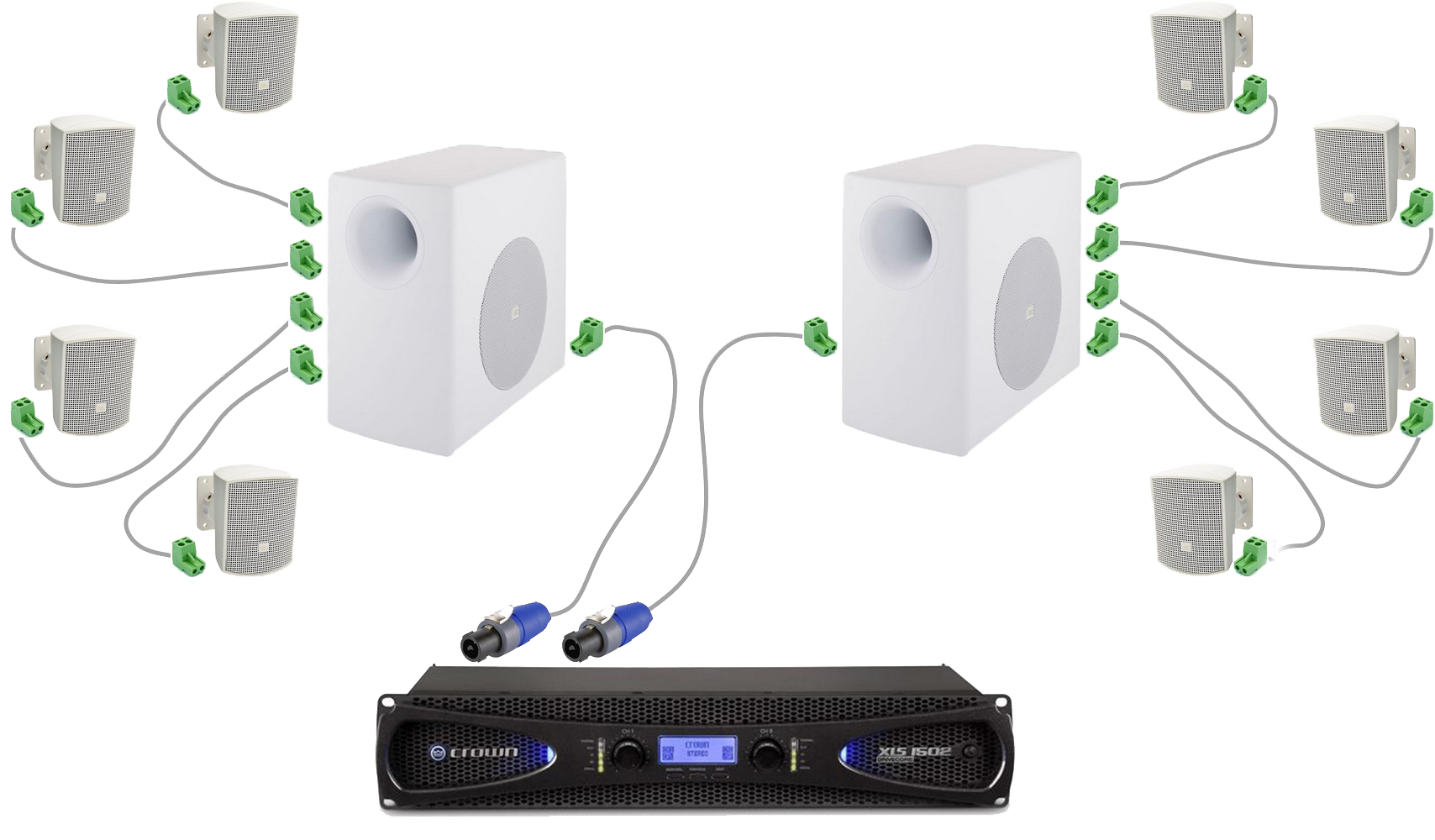 Керування та підсилення - Crown XLS1502. У комплекті - відповідний набір кабелів для швидкого підключення системи.