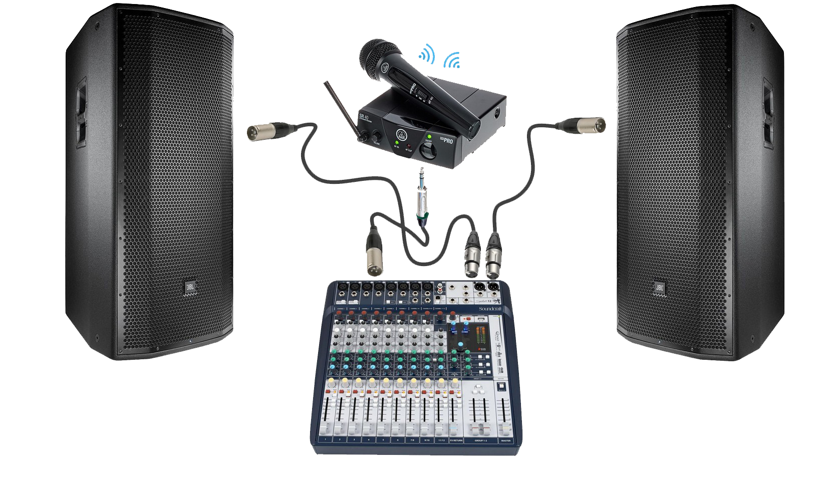 Звукове обладнання для акустичного виступу або невеликого концерту клубу на основі акустичних систем серії PRX 800 - зручне рішення для інсталяції або мобільного комплекту. Комплект складається з двох активних акустичних систем JBL PRX835W, радіосистеми AKG для вокаліста і мікшерного пульта Soundcraft. Залежно від потреби ми підбираємо радіосистему на ваш запит – вокальну чи інструментальну.
