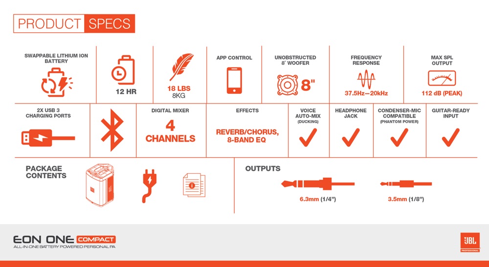 Акустична система EON ONE Compact обладнана всіма необхідними роз’ємами для підключення мікрофонів та інструментів, а також вбудованим мікшером з еквалайзером dbx та ефектами Lexicon (реверберація, хорус та ділей). Підключення через Bluetooth означає, що в перерві між живим виконанням Ви можете відтворювати музику через потокову передачу даних, а також, під'єднувати додаткові акустичні системи. Для EON ONE Compact створений мобільний додаток, через який можна керувати пристроєм.